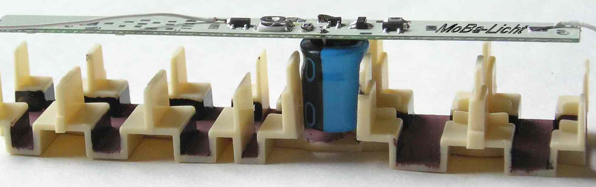 Wageninnenbeleuchtung für Personenwagen „Donnerbüchse“ neu (Fa. Tillig)(passend für die neue Ausführung mit Inneneinrichtung und offener Bühne), Tillig Art.-nr. 13010/ 13011) Lichtfarbe sgwTechnische Daten: klick oben ![]() Information: Beide Bausätze (Analog- und Digitalplatine) wurden speziell für den Einbau in Modellfahrzeuge Spur TT entwickelt und für diesen Wagen angepasst. Durch Einsatz moderner Bauelemente ist der Stromverbrauch äußerst niedrig. Die Helligkeit der Beleuchtung ist einstellbar und bleibt konstant. Der Einsatz eines Stützkondensators in Verbindung mit superhellen LEDs vermindert das Flackern und Aussetzer erheblich. Achten Sie trotzdem auf eine gute Stromaufnahme durch saubere Räder. Einbau/ Anschluss: Die Leiterplatte liegt auf der Inneneinrichtung. Bei der Analogvariante bestimmt der Stützkondensator den Einbauort. Bei der Digitalvariante ist der Kondensator natürlich auch im Abort plaziert, muss aber nachträglich angeschlossen werden. Empfehlenswert ist, die Inneneinrichtung der Wagen farblich zu gestalten. (Fußboden braun, falls Sie weiße LEDs einsetzen, die Sitze holzfarben). Die Stromaufnahme erfolgt im einfachsten Fall von den Blechlagerbügeln. Eine weitere Verbesserung der Stromaufnahme wird unter der Rubrik Tipps beschrieben. Die Abortwände sind nach Einbauanleitung so zu kürzen, dass der Kondensator dort Platz hat. Falls Sie die Analog-Beleuchtung abschaltbar machen wollen, können Sie an geeigneter Stelle im Wagenboden einen kleinen Stecker mit Jumper (Einzelteile E0050) einbauen.