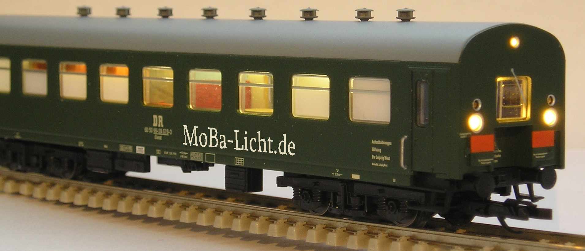 Information: Diese Bausätze wurden speziell für den Einbau in den Hilfszug der DR, für Mannschaftswagen, Gerätewagen bzw. Energieversorgungswagen für die Spur TT entwickelt. Durch den Einsatz moderner Bauelemente ist der Stromverbrauch meiner Beleuchtungen bekanntermaßen äußerst niedrig. Hier soll für ein Spitzenprodukt der Fa. Tillig eine Erweiterung, die die derzeitigen Möglichkeiten der Technik in etwa ausschöpft, gezeigt werden. Ich bin davon ausgegangen, dass in die Steuerwagen sowieso ein Dekoder eingesetzt wird. Folglich sind die Lichtleisten dafür (Anschluss an den Digitaldekoder) angepasst. Die Licht-LP des Gerätewagens hat einen integrierten Dekoder. An 2 freien Ausgängen lassen sich die Außenlampen anschließen und damit unabhängig schalten und dimmen. Die Möglichkeiten: Zum Eisatz kommt der Steck-Funktionsdekoder MX 680 (Zimo). Natürlich kann auch jeder andere Funktionsdekoder (z.B. Kress) mit Abstrichen an dem Funktionsumfang eingesetzt werden. Die Funktionen im Einzelnen: F 0vorwärts = Ausgang Licht weiß, F 0rückwärts = Ausgang Schlusslicht, F1 = FA1 ... Besprechungsraum, F2 = FA2 ... 2. Raum und Umkleide, F3 = FA3 … Gang, F4 = FA4 … Waschraum, F5 = FA5 … Chefzimmer, dazu CV 124 auf 128 setzen F6 = FA6 … Führerstand, (FA5 und FA6 werden als TTL-Ausgang direkt benutzt und mit 0,8 mA bei 5 V belastet). Da der Nachfolger des o.g. Dekoders nur noch 6 verstärkte Ausgänge (MX 671N) hat, werden jetzt die für FA5 und FA6 vorgesehenen LEDs für verstärkte Funktionsausgänge ausgestattet und können an einen beliebigen anderen Funktionsausgang mit angeschlossen werden. Einbau: Da die vorhandene Stromversorgung des Wagens sehr gut funktioniert, wird sie auch genutzt. Die Leiterplatte liegt über den Stegen des Wagenkastens.Die LED-Aufteilung ist hier so gestaltet, dass nicht gefäst werden braucht. ![]() Optionen: Trotz guter Stromaufnahme ist es sinnvoll am Dekoder ein Speicherbaustein anzuschließen. Die Kondensatorbaugruppe nach einem Schaltungsvorschlag des Dekoder-Herstellers. ![]() links ist die Leiterplatte für den Mannschaftswagen abgebildet Lieferumfang: - 1 Beleuchtungsleiterplatte (geprüft) (die Kondensatorgruppe bitte extra bestellen) (die Außenlampen für Energieversorgungswagen und Gerätewagen bitte extra bestellen) Bezug und Information: - Bestellung auf www.MoBa-Licht.de Falls Sie die Beleuchtung nicht selbst einbauen wollen oder können, den Kompletteinbau übernehme ich auch. Lassen Sie sich ein Angebot erstellen. Wahrscheinlich schneller hier; - KöMo (René Köppe) |