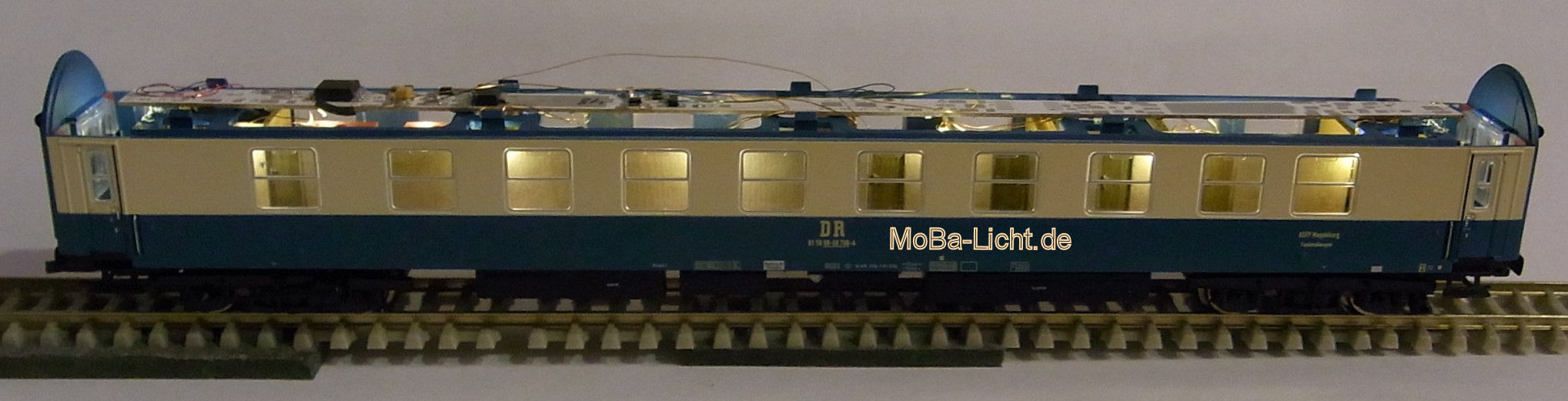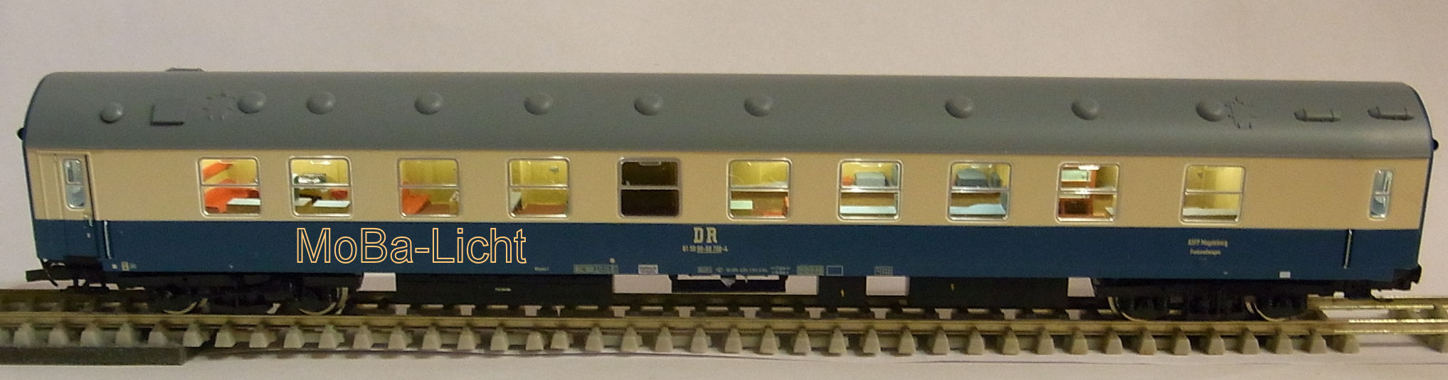 Einbau: In allen 3 Fällen liegt die Lichtleiterplatte auf den oberen Querstreben des Wagenkastens. Die Befestigung erfolgt mit Hin und Weg, Pritt Vielzweckkleber, Heißkleber o.ä. Schwerer ist es, eine zuverlässige Stromversorgung zu realisieren. Da auch die Steuerwagen mit 69 g viel leichter sind, als andere Steuerwagen, habe ich die Wagen auf 8-Punkt-Stromaufnahme umgestellt. Achten Sie trotzdem auf eine gute Stromaufnahme durch saubere Räder! Fehlen jetzt nur noch die Reisenden. Bezug und Information: - Bestellung auf www.MoBa-Licht.de Falls Sie die Beleuchtung nicht selbst einbauen wollen oder können, übernehme ich nur in Ausnahmefällen den Einbau. Lassen Sie sich ein Angebot erstellen. |