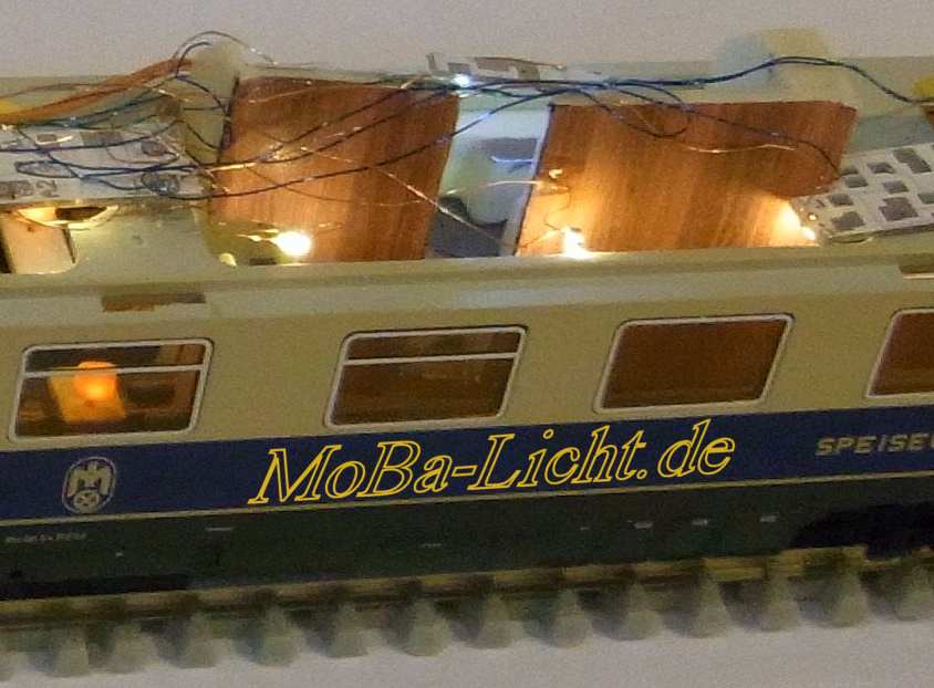 Information: Da für die Analogvariante vom Hersteller eine passende Innenbeleuchtung angeboten wird, beschänke ich mich auf eine Digitalvariante. Die Digitalvariante zeichnet sich aus durch: - integrierten Dekoder (DCC) - Anschluss für beleuchtete Tischlampen (schaltbar) vorhanden - Die Tischlampen sind nicht Bestandteil dieses BS, bitte extra bestellen s.h. unten - Küche oben und unten beleuchtet und schaltbar - Gang zur Bar und Bar extra beleuchtet - (da der Wagen im Normalfall nie als letzter eingereiht war, habe ich auf eine Schussbeleuchtung verzichtet). Einbau: Alle sichtbaren LEDs liegen etwa mittig über den Fensterausschnitten. Dazu müssen im Wagenkasten 2 Stege etwas bearbeitet werden. Am einfachsten mit einem kleinen Fingerfräser ca.4 mm ausfräsen. Die Leiterplatten liegen auf den Stegen und können mit doppelseitigem Klebeband oder mit Hin und Weg angeklebt werden. Die beiden einzelnen LEDs werden mit den Anschlussdrähten über den Fensterzwischenräumen im Gang positioniert. ![]() Für die untere und obere Küche sind die kleinen LPs mit je 2 weißen LEDs und den Vorwiderständen gedacht. ![]() Zur besseren Gestaltung der Inneneinrichtung habe ich Küchen- und Bareirichtungen aus dem Internet gesucht, verkleinert, ausgedruckt und aufgeklebt. Ebenso sind die Sitze und das Furnier der Wände entstanden, wobei ich das Edelholzfurnier zugunsten einer besseren Sichtbarkeit etwas aufgehellt habe. Der Speicher besteht hier aus 2 Elkos 220 µF/25V und findet neben der Küche unter der Bar Platz. ![]() Leider ist auch bei diesen Wagen die Stromversorgung für ein Digitalsignal nicht tauglich. Ich ersetze die Radsätze durch mittig geteilte von Mod-Müller. Die Metalleinsätze der Drehgestele schneide ich auseinander und löte an beide Hälften Dekoderlitze an, die ich bis zur LP führe. Optionen: Tischlampen fertig oder als Teilesatz 16 Tischlampen Artikelnr. E0293-16 (warmweiß) Teilesatz zum Selbstbau E0294-16 (warmweiß) 16 Tischlampen Artikelnr. E0295-16 (orange) Teilesatz zum Selbstbau E0296-16 (orange) Auf der Digitalleiterplatte sind die Anschlüsse für die Tischlampen bereits vorhanden (getrennt einschaltbar und dimmbar). Lieferumfang: - 1 Beleuchtungsleiterplatte (geprüft und voreingestellt) Bezug und Information: - Bestellung auf www.MoBa-Licht.de 4g Falls Sie die Beleuchtung nicht selbst einbauen wollen oder können, den Kompletteinbau übernehme ich auch. Lassen Sie sich ein Angebot erstellen. |