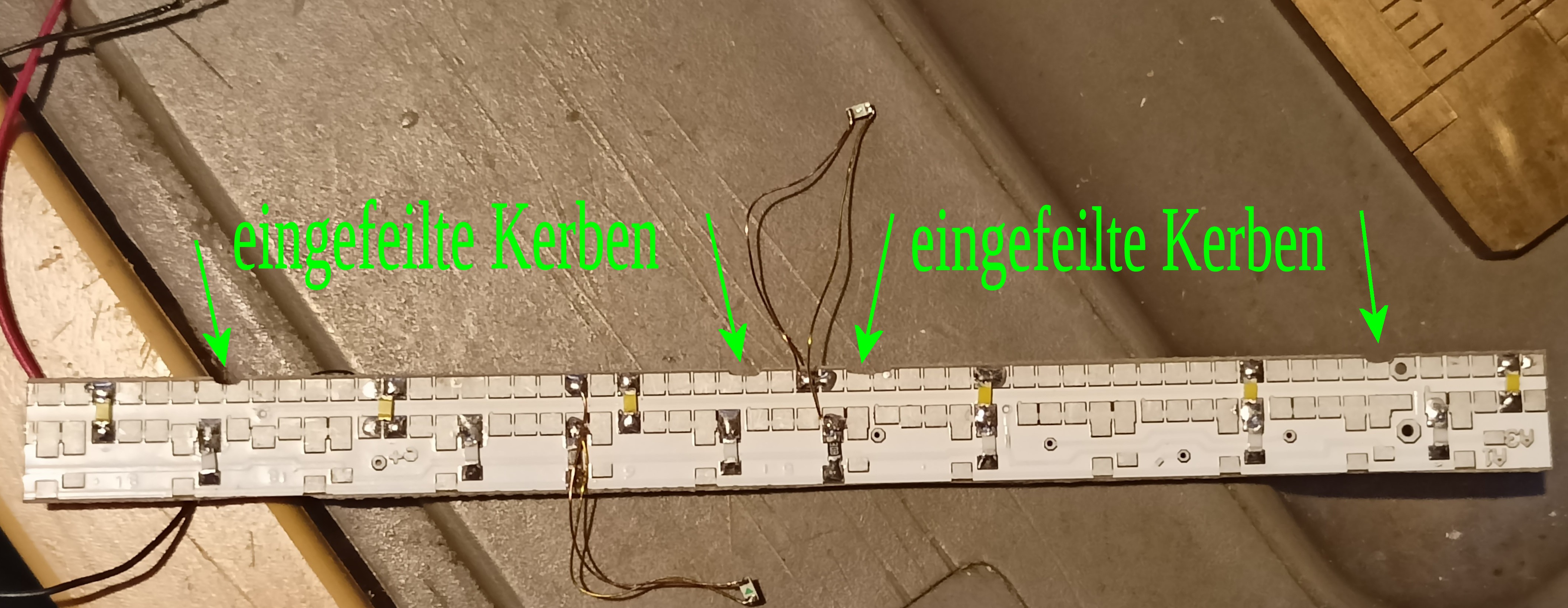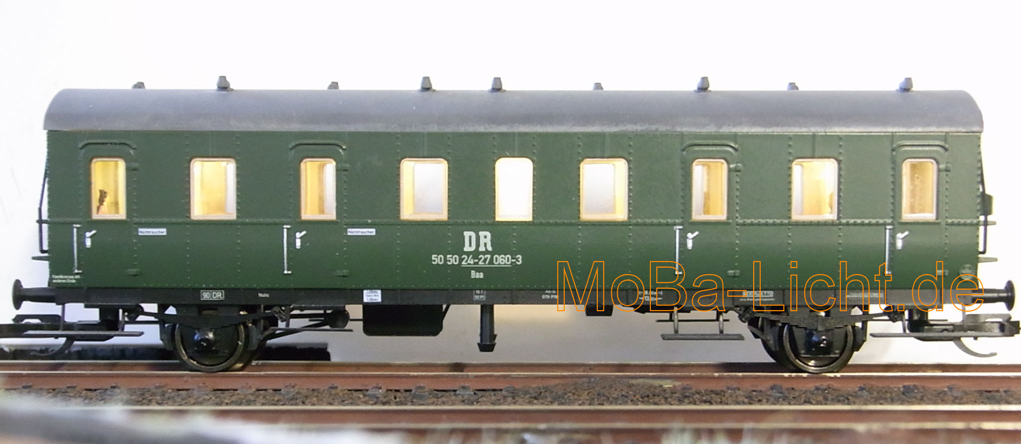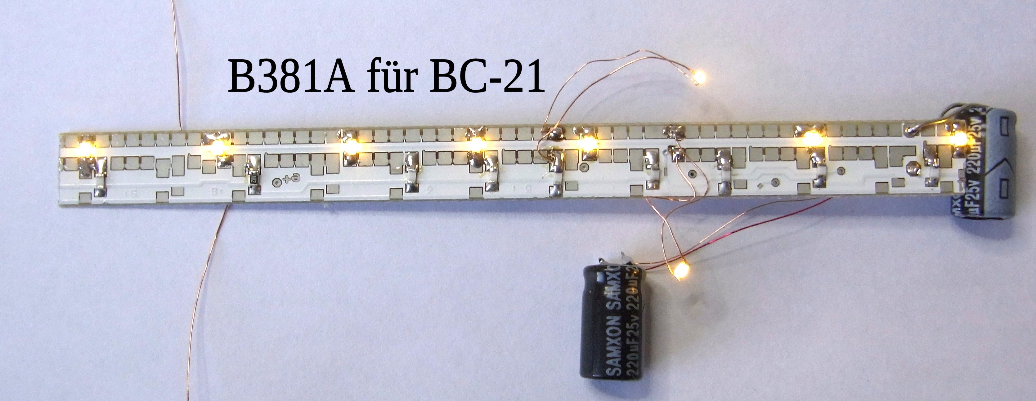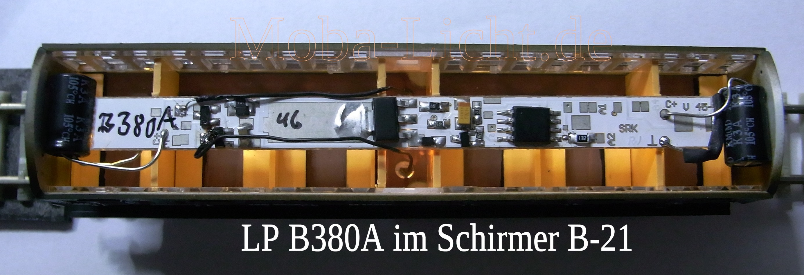 Wageninnenbeleuchtung für Einheitsabteilwagen B-21/ BC-21/ D-21a/ D21-b (Fa. Schirmer)Technische Daten: klick oben Bild: D-21 mit LEDs Golden White, zum Reingucken klick auf's Bild Information: Die Beleuchtungssätze wurden speziell für den Einbau in diese Wagen abgestimmt. Da für optimale Vorbildtreue über jeder Sitzgruppe/ Fenster je eine LED angebracht ist, (im Gegensatz zu Mitbewerbern auch in den Vorräumen), gibt es auch 3 verschiedene Leiterplatten; Nr. B380A für den B-21, 1 Abort mittig, 6 Sitzgruppen, 6 Außentüren je Seite Nr. B381A für den BC-21, 2 Aborte außermittig, 5 + 2 Sitzgruppen, 6 Außentüren je Seite Nr. B382A für den D-21b, 2 Aborte mittig 8 Sitzgruppen, 4 Außentüren je Seite Durch Einsatz moderner Bauelemente ist der Stromverbrauch recht niedrig.(digital ca. 14 mA) Die Helligkeit der Beleuchtung ist natürlich einstellbar und bleibt auch bei der Digitalvariante konstant. Obwohl der Wagen von allen 4 Rädern Strom aufnimmt, ist bei beiden Varianten ein Stützkondensator enthalten. Achten Sie trotzdem auf eine gute Stromaufnahme durch saubere Räder. Bei der Digital-Lp ist das Licht vorbildentsprechend in 2 Stränge aufgeteilt und lässt sich so auch zu und abschalten.?? Einbau/ Anschluss: Die Dächer sind abnehmbar. Die Leiterplatte liegt auf der Inneneinrichtung. Der Platz zwischen den Haltenasen auf den Zwischenwänden für die LPs ist leider etwas zu schmal ausgefallen. Entweder Sie schneiden einen Knuppel ab, oder Sie feilen mit einer Schlüsselfeile eine Nut an der entsprechenden Stellen in die LP (ca. 0,4 mm tief). Die Leiterplatte kann zum Schluss dort aufgeklebt werden. (Ich nehme dafür "Hin und weg"). Die Kondensatoren können im Abort eingebaut werden, oder auch waagerecht, quer in Höhe der LP unmittelbar unter dem Dach. ![]() Bild: B380A Klick zum vergrößern Die Stromaufnahme ist vom Hersteller gut vorbereitet. Empfehlenswert ist, die Inneneinrichtung der Wagen farblich zu gestalten. (Fußboden braun, die Sitze holzfarben bzw. Polster blaugrau oder grün). Bild B381A Klick zum vergrößern Nach einer Idee eines befreundeten Modellbahners lassen sich die Kondensatoren auch unterm Dach verstecken, um dann den Abort auch noch zu beleuchten. Die Elkos dürfen auf keinen Fall gequetscht werden. Natürlich können auch die Elkos durch Keramikkondensatoren ersetzen. Im Dach lassen sich mühelos 12 Stück (100 µF/25 V Bestell-nr. E0041) unterbringen. Die Kondensatoren sind mit Schrumpfschlauch zu isolieren. Im Sinne des technischen Fortschrittes biete ich die B380B universell für alle EAW's an. Vorteile: gut passende Farbe, eine LP für alle Wagen. Nachteile: in die Zwischenwände muss eine Aussparung ca. 2 mm tief mit R = 2 mm eingefeilt/ gefräst werden, das 1. und letzte Fenster des Wagen ist geringfügig dunkler. ![]() Bild: neu mit COB-led - B380B Klick zum vergrößern Lieferumfang: - 1 Beleuchtungsleiterplatte einbaufertig (geprüft und voreingestellt) Bezug und Information: Bestellung auf info(at)moba-licht.de |