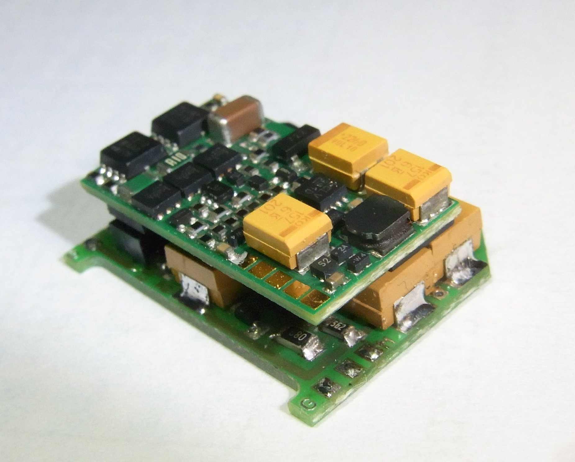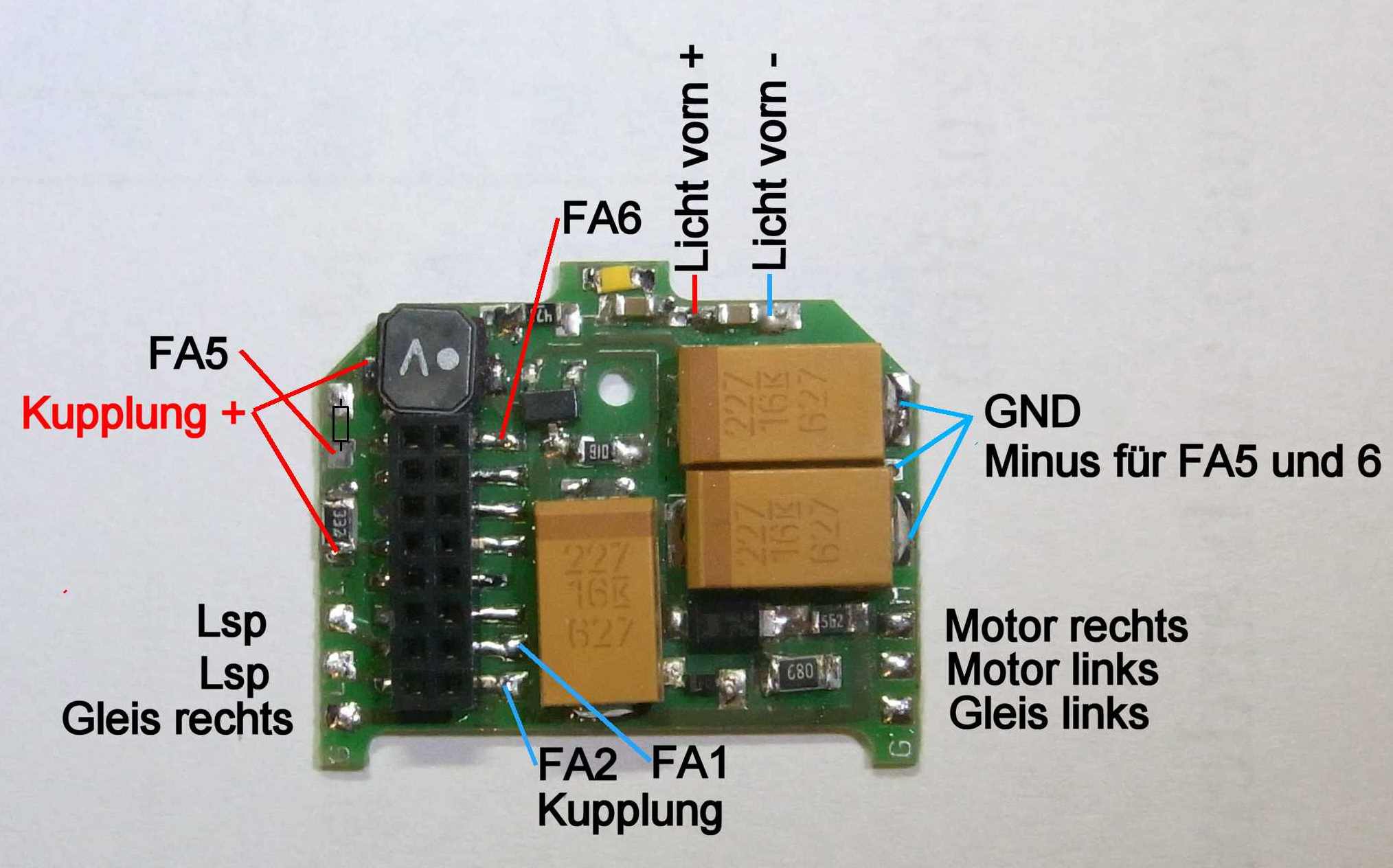 Bild mit Dekoder MX648 P16 Fa. Zimo - - draufklicken zum Vergrößern Information: Durch Austausch der Leiterplatte wird der problemlose Einsatz moderner Sounddekoder, wie z.B. MX648-P16 in der BR75 möglich. Ebenfalls möglich sind MX622, MX623, MX630P P12 oder P16 und andere Produkte unter Beachtung der Einbaumaße. Die LP enthält 3 Pufferkondensatoren mit der erforderlichen Schutzschaltung zur Spannungsbegrenzung und einer Drossel, um das Auslesen der CV nicht zu beeinträchtigen. Der Lautsprecher kann direkt auf den Dekoder platziert werden. Die fertige LP ist mit 1 LED in der Lichtfarbe Golden-White ausgerüstet und entsprechen eher dem Glühlampenlicht, als die der ursprünglichen LP. Einfacher Einbau: sh. oben ![]() Bild Anschlüsse - - draufklicken zum Vergrößern Optionen: An FA1 und FA2 kann die Digitalkupplung Nr. 1501 von SD-Modell angeschlossen werden. Der Plus-Pol für die Kupplung steht am Widerstand 8 (s. h. Bausatzerklärung) oder an der Drossel 16 zur Verfügung. Es lassen sich auch beide Kupplungen parallel an einem FA betreiben. Ausgang 5 und 6 sind unverstärkte Ausgänge. Moderne LEDs können über einen Vorwiderstand von ca. 1kO angeschlosssen werden. Damit lässt sich eine Führerstandsbeleuchtung und Feuerbüchsenflackern realisieren. Der Minuspol dafür kann an den Kondensatoren abgenommen werden. NUE: Ab sofort biete ich den BS und die fertig bestückte LP auch mit größeren Kapazitäten (330myF statt 220myF) an. Lieferumfang: - Bausatz (LP gebohrt, alle Teile, Anleitung) oder Fertigplatine (ohne Dekoder) Bezug und Information: Bestellungen werden entgegengenommen - Bestellung auf www.MoBa-Licht.de 2,0 g Falls Sie die LP nicht selbst einbauen wollen oder können, den Kompletteinbau übernehme ich auch. Lassen Sie sich ein Angebot erstellen. |