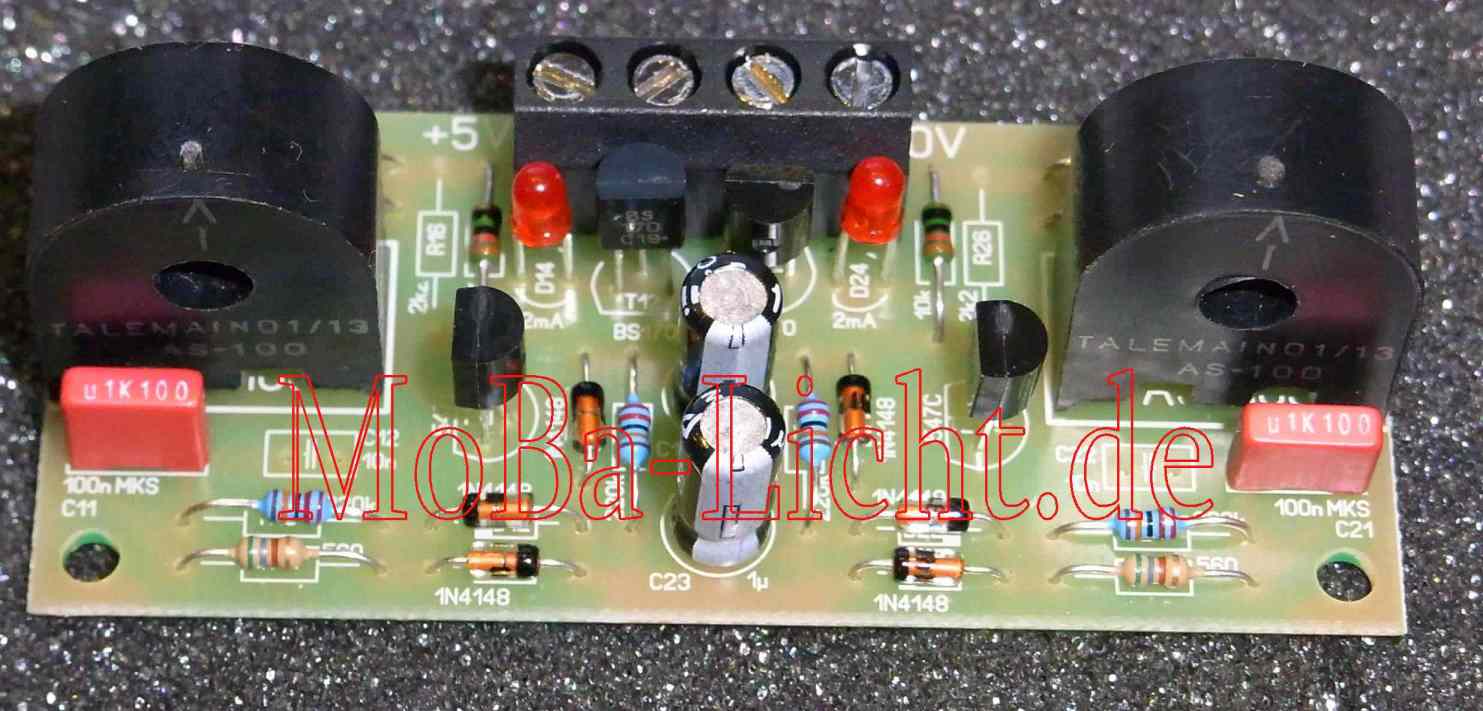 Information: Entgegen den weitläufig bekannten Gleisbesetztmeldern, bei denen ein Spannungsabfall im Bahnstromkreis erkannt wird, wurde diese geniale Schaltung von Helmut Schäfer entworfen. Hier erfolgt die Erkennung über einen Trafo. Dazu wird lediglich ein Pol der Bahnzuleitung durch das Loch im Trafo geführt. Es gibt somit keinerlei elektrische Verbindung zwischen Meldeelektronik und Bahnstromkreis und damit auch kein Spannungsabfall. Die Schaltung ist so empfindlich, dass Loks, Wagen mit Dekoder oder auch nur Widerstandsachsen mit max. 16kOhm (Forderung nach NEM) erkannt werden. Es reicht, wenn die Zuleitung des zu überwachenden Gleises (nur 1 Pol) durch das Loch des Trafos geführt wird. Die Besetztmeldung erfolgt durch auf Masse (-) schalten des Ausganges und wird durch eine LED angezeigt. An den Ausgang können weitere LEDs über entsprechende Vorwiderstände oder ein Relais angeschlossen werden. Ebenso ist die Verbindung mit vielen digitalen Meldebausteinen zur Weiterleitung an eine Digital-Zentrale und/oder an einen Rechner möglich. Der Ausgangsstrom sollte 300mA nicht überschreiten. Weitere Beschreibung und Einsatzmöglichkeiten in einer Anleitung vom "technischen Vater": Daten: 5V Variante: Spannung 5V - Stromverbrauch 5/ 7mA - Empfinflichkeit ca. 22 kOhm - max. Ausgangsstrom 500mA 12V Variante: Spannung 12V - Stromverbrauch 2,3/ 3mA - Empfinflichkeit ca. 22 kOhm - max. Ausgangsstrom 500mA Anschluss von Relais und LED: ![]() Optionen: Mittlerweile sind recht günstige Relaisplatinen z.B. für den Arduino auf dem Markt. Sowohl die Variante mit und auch ohne Optokoppler lassen sich anschließen. ![]() Lieferumfang: - sh. oben 24g Bezug und Information auch : - Die Digitalzentrale - Bestellung auf www.MoBa-Licht.de |