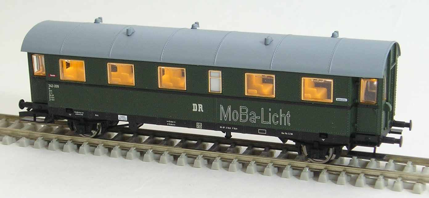 Wageninnenbeleuchtung für Personenwagen „Donnerbüchse“ neu Bi 29 (Fa. Tillig)(passend für die neue Ausführung mit Inneneinrichtung und geschlossener Bühne), Tillig Art.-nr. 13001/ 13002) Lichtfarbe gelb/ sgwTechnische Daten: klick oben ![]() Information: Beide Bausätze (Analog- und Digitalplatine) wurden speziell für den Einbau in Modellfahrzeuge Spur TT entwickelt und für diesen Wagen angepasst. Durch Einsatz moderner Bauelemente ist der Stromverbrauch äußerst niedrig. Die Helligkeit der Beleuchtung ist einstellbar und bleibt konstant. Der Einsatz eines Stützkondensators in Verbindung mit superhellen LEDs vermindert das Flackern und Aussetzer erheblich. Achten Sie trotzdem auf eine gute Stromaufnahme durch saubere Räder. Einbau/ Anschluss: Die Leiterplatte liegt auf der Inneneinrichtung. Bei der Analogvariante bestimmt der Stützkondensator den Einbauort. Bei der Digitalvariante ist der Kondensator natürlich auch im Abort plaziert, muss aber nachträglich angeschlossen werden. Empfehlenswert ist, die Inneneinrichtung der Wagen farblich zu gestalten. (Fußboden braun, falls Sie weiße LEDs einsetzen, die Sitze holzfarben). Die Stromaufnahme erfolgt im einfachsten Fall von den Blechlagerbügeln. Eine weitere Verbesserung der Stromaufnahme wird unter der Rubrik Tipps beschrieben. Die Abortwände sind nach Einbauanleitung so zu kürzen, dass der Kondensator dort Platz hat. Falls Sie die Analog-Beleuchtung abschaltbar machen wollen, können Sie an geeigneter Stelle im Wagenboden einen kleinen Stecker mit Jumper (Einzelteile E0050) einbauen.
