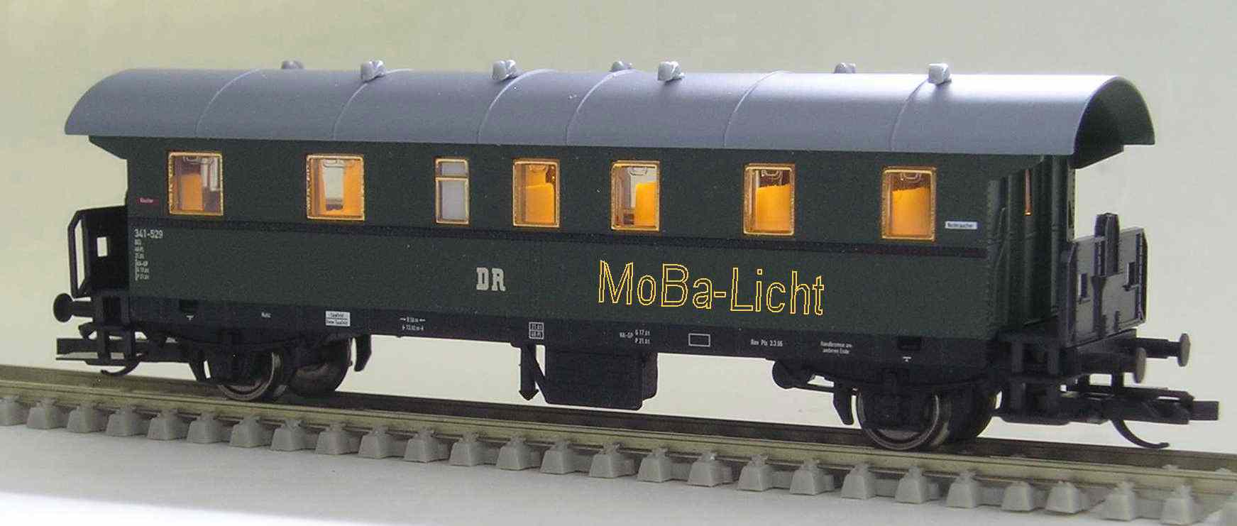 Wageninnenbeleuchtung für Personenwagen „Donnerbüchse“ neu (Fa. Tillig)(passend für die neue Ausführung mit Inneneinrichtung und offener Bühne), Tillig Art.-nr. 13010/ 13011) Lichtfarbe sgwTechnische Daten: klick oben ![]() Information: Beide Bausätze (Analog- und Digitalplatine) wurden speziell für den Einbau in Modellfahrzeuge Spur TT entwickelt und für diesen Wagen angepasst. Durch Einsatz moderner Bauelemente ist der Stromverbrauch äußerst niedrig. Die Helligkeit der Beleuchtung ist einstellbar und bleibt konstant. Der Einsatz eines Stützkondensators in Verbindung mit superhellen LEDs vermindert das Flackern und Aussetzer erheblich. Achten Sie trotzdem auf eine gute Stromaufnahme durch saubere Räder. Einbau/ Anschluss: Die Leiterplatte liegt auf der Inneneinrichtung. Bei der Analogvariante bestimmt der Stützkondensator den Einbauort. Bei der Digitalvariante ist der Kondensator natürlich auch im Abort plaziert, muss aber nachträglich angeschlossen werden. Empfehlenswert ist, die Inneneinrichtung der Wagen farblich zu gestalten. (Fußboden braun, falls Sie weiße LEDs einsetzen, die Sitze holzfarben). Die Stromaufnahme erfolgt im einfachsten Fall von den Blechlagerbügeln. Eine weitere Verbesserung der Stromaufnahme wird unter der Rubrik Tipps beschrieben. Die Abortwände sind nach Einbauanleitung so zu kürzen, dass der Kondensator dort Platz hat. Falls Sie die Analog-Beleuchtung abschaltbar machen wollen, können Sie an geeigneter Stelle im Wagenboden einen kleinen Stecker mit Jumper (Einzelteile E0050) einbauen.