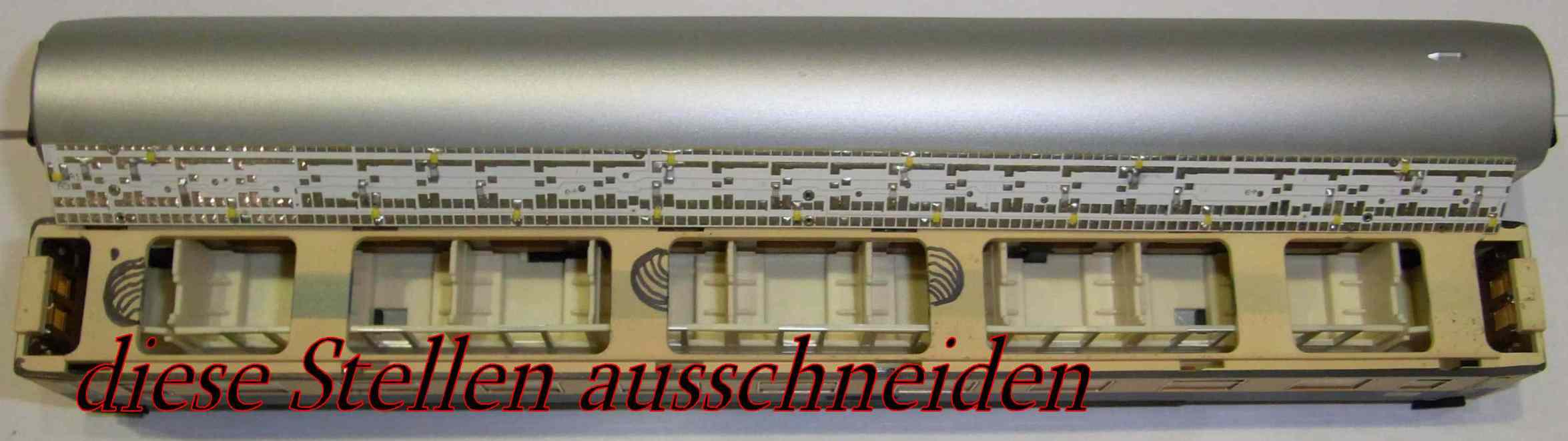 Bild: 9 Abteile (Avmz 111, TEE, 13575) Lichtfarbe warmweiß - Klick zum Vergrößern Information: Diese Bausätze (Analog- und Digitalplatine) wurden speziell für den Einbau in Modellfahrzeuge Spur TT entwickelt und für diesen Wagen angepasst. Die "bessere" Variante ist 12 mm breit hat natürlich in jedem Abteil 1 LED im Gang 6 und je 1 in den Türbereichen. Auf Wunsch sind auch noch in den Aborten LEDs anschliesbar (E 0002 bestellen). Die beiden "sparsameren" Varianten sind 8mm breit und haben 1 LED-Reihe. Durch Einsatz moderner Bauelemente ist der Stromverbrauch äußerst niedrig. Die Helligkeit der Beleuchtung ist einstellbar und bleibt konstant. Der Einsatz eines Stützkondensators in Verbindung mit superhellen LEDs vermindert das Flackern und Aussetzer erheblich. Achten Sie trotzdem auf eine gute Stromaufnahme durch saubere Räder. Einbau: Die Leiterplatte liegt über den Stegen des Wagenkastens und wird prinzipiell durch den Kondensator platziert. Leider hat der Hersteller nicht damit gerechnet, dass jemand über jedem Abteil Licht einbauen könnte. An 3 Stellen müssen die Stege etwas ausgearbeitet werden (feilen oder fräsen).