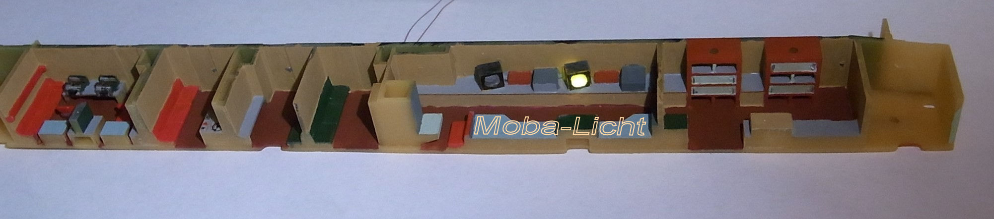 Klick zum Vergrößern Warum das Ganze, Ausgehend von meinen vorhandenen Varianten für die Y-Wagen, habe ich auch für diese attraktiven Wagen meine Beleuchtung angepasst. Die Inneneinrichtung besteht offensichtlich aus einem 3-D-Druck (Der aufdringliche Gestank ging bei mir nach 2-maligen Abwaschen mit Spiritus und einer gewissen Abluftphase nicht gleich weg.) Ich habe dann die Inneneinrichtung noch etwas mit Farbe versorgt. Glücklicherweise sind unter den Monitoren Löcher vorhabden, die in meinen Augen nach Einstecken einer LED schrieen. Einen der beiden habe ich von unten beleuchtet - gelb entsteht aus einer ww-LED. Kann sein, dass es KRS (oder wie die damals hießen) so war, (ich hatte damals das Glück an einem HP rumspielen zu dürfen, der hatte schon weiße Schrift.)