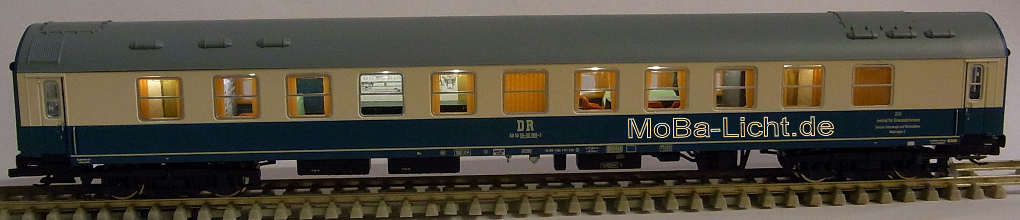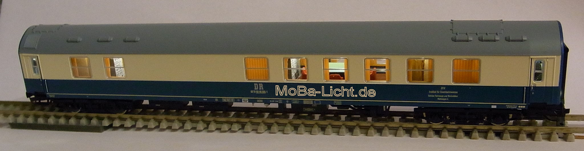 Klick zum Vergrößern Der Messwagen 2 besitzt ein Steuerwagenabteil mit kleiner LP mit einer 6-poligen Schnittstelle. Daher ist es vom Aufwand her günstiger einen Funktionsdekoder (Kres , Zimo MX671N) zu stecken und daran die Wagenbeleuchtung anzuschließen. So ist auch die B3417 konzipiert. Die Inneneinrichtung hat wieder etwas Farbe bekommen.