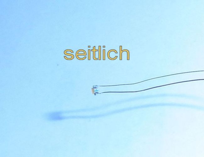 SMD LED Golden White® von YolDal10 SMD LEDs 10,00 € 20 SMD LEDs 19,00 € 50 SMD LEDs 45,00 € andere Mengen auf Anfrage Beschreibung: - Farbeindruck: ähnlich dem Licht einer Glühlampe, seit Jahren und immer noch die beste LED für Loklaternen - Bauform: SMD 0603, l x b x h = 1,6 x 0,8 x 0,8 mm - Vorwärtsspannung = 3,2Vmax , Sperrspannung = 5 V ! - Helligkeit typ.300mcd - Strom max. = 20 mA (als Loklaterne reicht ca. 1 mA ) - Anode (+) ist durch den Querstrich auf der Rückseite gekennzeichnet - Betrieb nur mit Vorwiderstand oder Konstantstromquelle K2 (ohne Vorwiderstand) Für Bastler, die sich noch nicht trauen diese kleinen Teile direkt zu löten: SMD LED Golden White® von YolDal bedrahtet - mit ca. 10 cm langen Cul-Drähten Ø 0,15/0,1 mm - Natürlich können Sie bei der Bestellung angeben, ob die Drähte seitlich, nach unten oder nach hintern weggeführt werden sollen. Wichtige Information: Betrieb auf einer Modellbahnanlage sollte nur über Vorwiderstand am Digitaldekoder oder mit den Konstantstromquellen K2, K3 oder KS erfolgen! Unzureichende Motorentstörung kann diese LEDs zerstören! Bezug und Information: - Bestellung auf www.MoBa-Licht.de - Datenblatt(http://www.yoldal.com) |