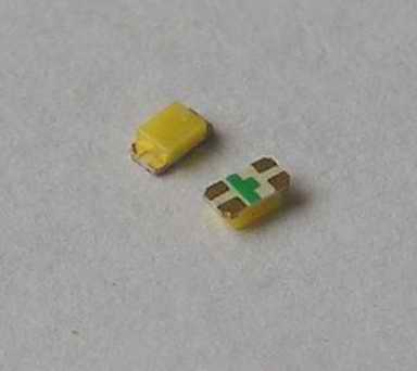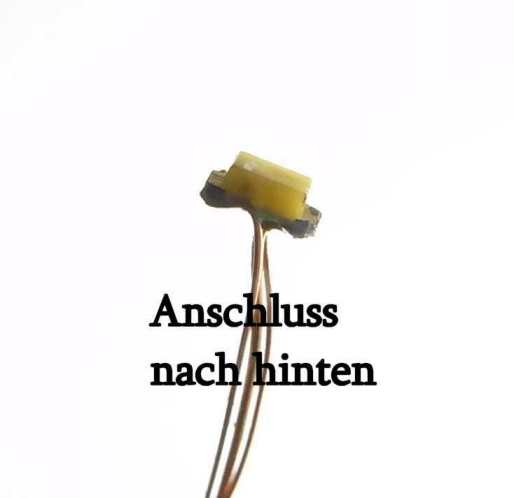 SMD LED Bauform 0603 warmeiß und rot in einem Gehäuse2 SMD LEDs 0603 warmweiß/ rot 2,20 € 10 SMD LEDs DF 0603 warmweiß/ rot 10,80 € andere Mengen auf Anfrage Beschreibung: - Farbeindruck: warmweiß, ähnlich dem Licht einer Halogenlampe - bzw. hellrot - Bauform: SMD 0603 flach, l x b x h = 1,6 x 0,8 x 0,6 mm - Vorwärtsspannung = 3,2V warmweiß/ 2,0V rot max , Sperrspannung = 5 V beide! - Helligkeit ww ca. 150mcd, rot ca. 45mcd (die Helligkeit wird etwa gleich empfunden) - Strom max. = je 20 mA - Anode (+) ist durch die Breitseite der Markierung auf der Rückseite gekennzeichnet - Beide Anoden sind verbunden! Die Lichtpunkte haben einen sichtbaren Abstand von ca. 0,5mm - Betrieb nur mit Vorwiderstand Diese LEDs lassen sich (über Vorwiderstand) direkt an einen Digitaldekoder anschließen. Für Bastler, die sich noch nicht trauen diese kleinen Teile direkt zu löten (hier müssen auf 0,8mm Breite 2 Drähte angelötet werden und dazwischen sollte auch noch ein Stück Luft zur Isolation frei bleiben): 1 SMD LED 0603 ww/ r bedrahtet 3,20 € (mit 3 ca. 10 cm langen Cul-Drähten Ø 0,15/0,1 mm) Wichtige Information: Betrieb sollte nur über Vorwiderstand am Digitaldekoder oder mit den Konstantstromquellen K2, K3 oder KS erfolgen! Unzureichende Motorentstörung kann diese LEDs zerstören! Bezug und Information: - Bestellung auf www.MoBa-Licht.de |