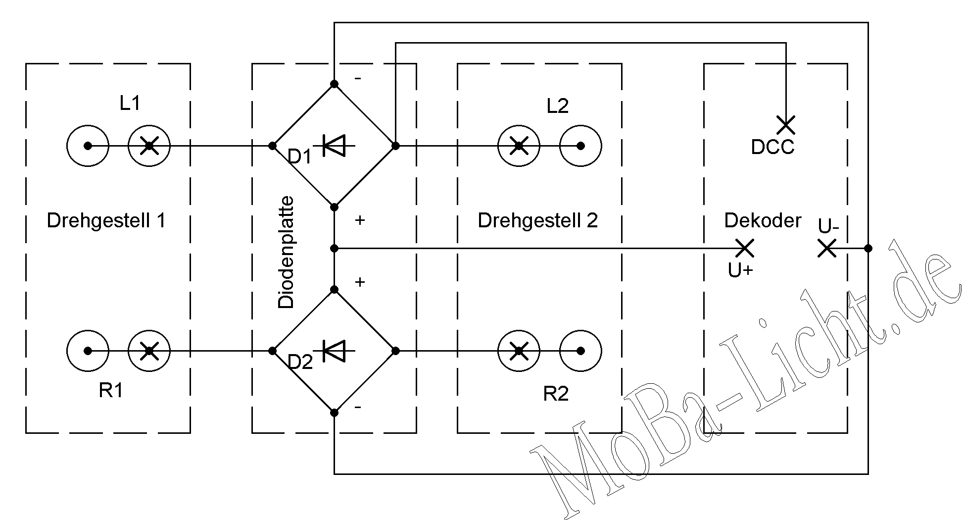 Dekoder eine Spannungszuführung einrichten. Natürlich müssen die zusätzlichen Dioden (vom 2. Drehdestell/ Wagen) artgleich sein